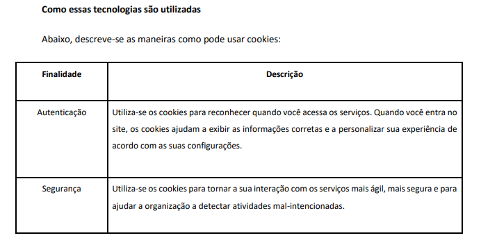 As tabelas de cookies listam alguns dos cookies usados pela organização e por terceiros como parte dos Serviços. Observe que essas tabelas podem ser atualizadas de tempos em tempos para fornecer a você as informações mais recentes.